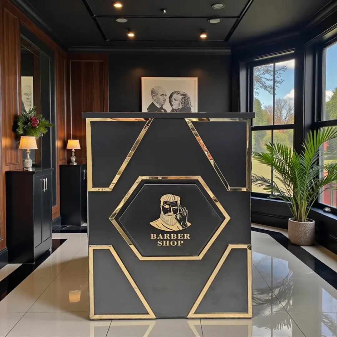 Accueillez vos clients avec le comptoir Caisse IGOR, un meuble de réception en bois de haute qualité, spécialement conçu pour les salons de coiffure et les barbiers.