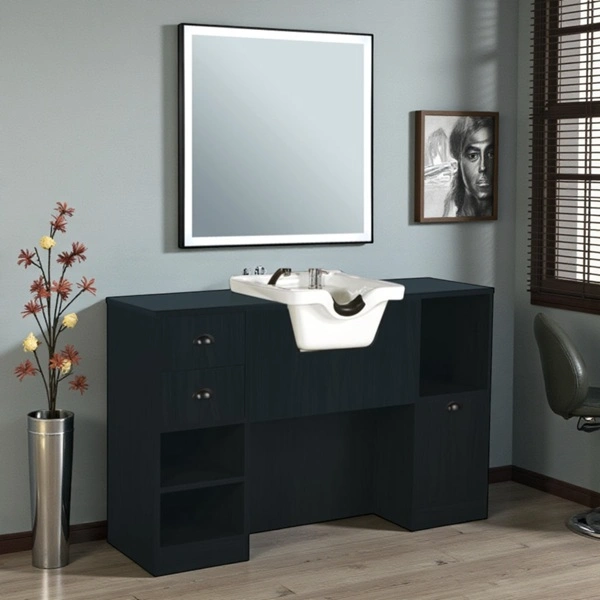 Ce poste de coiffage dispose d’étagères ouvertes, de tiroirs spacieux et de colonnes latérales. Ainsi, vous gardez tous vos outils et produits à portée de main, ce qui améliore votre organisation pendant chaque séance.