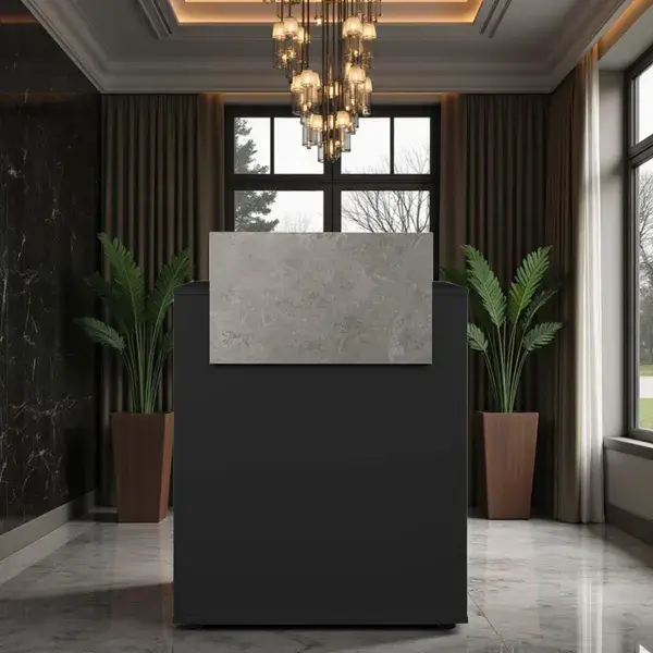 Le meuble d’accueil Dylan fabriqué en panneau de particules de haute densité, recouvert de papier mélaminé noir sur les deux faces.