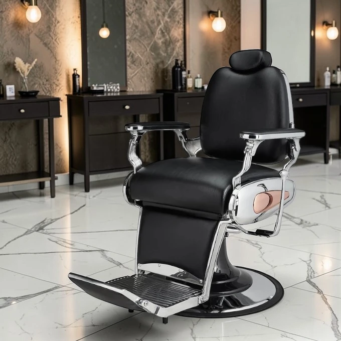 Ce fauteuil se distingue par son élégance rare. Son revêtement noir lisse est sublimé par des finitions en métal brillant et des touches cuivrées sur les côtés de l’assise. C’est un choix stratégique pour les barbiers qui souhaitent offrir une expérience visuelle luxueuse à leur clientèle.