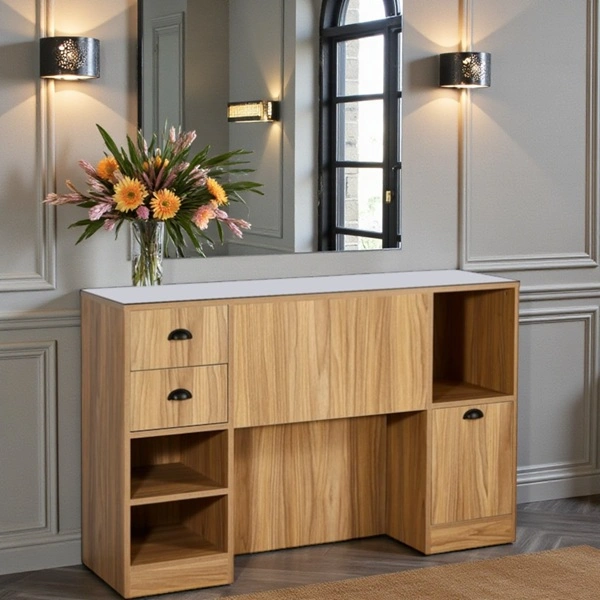 Avec ses multiples rangements, étagères, tiroirs et colonnes, cette coiffeuse vous permet d’avoir tout à portée de main.