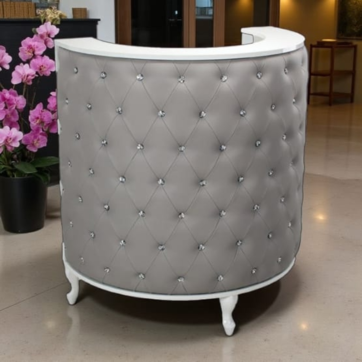 Le meuble de réception OBSESSION I est un véritable atout pour valoriser votre salon. Grâce à son design arrondi et capitonné, décoré de cristaux Swarovski®, il apporte une touche de prestige à votre espace professionnel.
