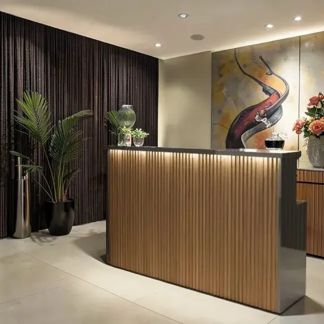 Ce comptoir d’accueil haut de gamme adopte un design italien moderne et structuré. Ainsi, votre espace réception devient un véritable élément décoratif. Dès l’arrivée, les clients découvrent un environnement professionnel, élégant et parfaitement organisé.
